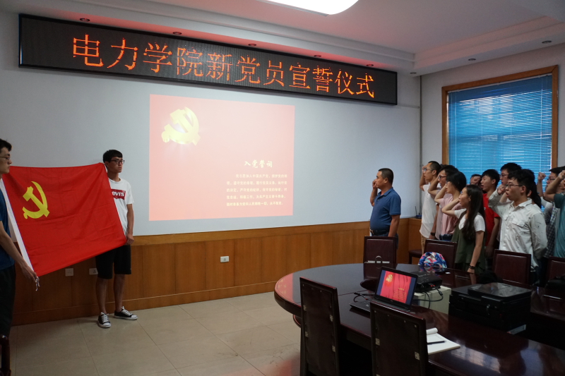 此次活动包括新党员宣誓和老党员重温入党誓词、毕业生党员座谈两部分内容。赵惠民领誓,带领新发展党员面对党旗庄严宣誓,与会党员也一起重温了入党誓词。毕业生党员畅所欲言,分享了自己在校四年思想、学习、生活方面的经历和感悟;提出了改进学院学生管理工作的意见建议,表达了对于电力学院以及各位领导老师的感激之情。